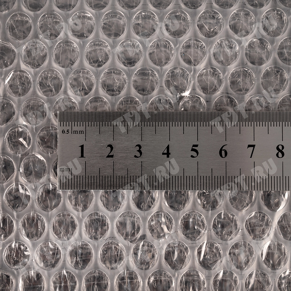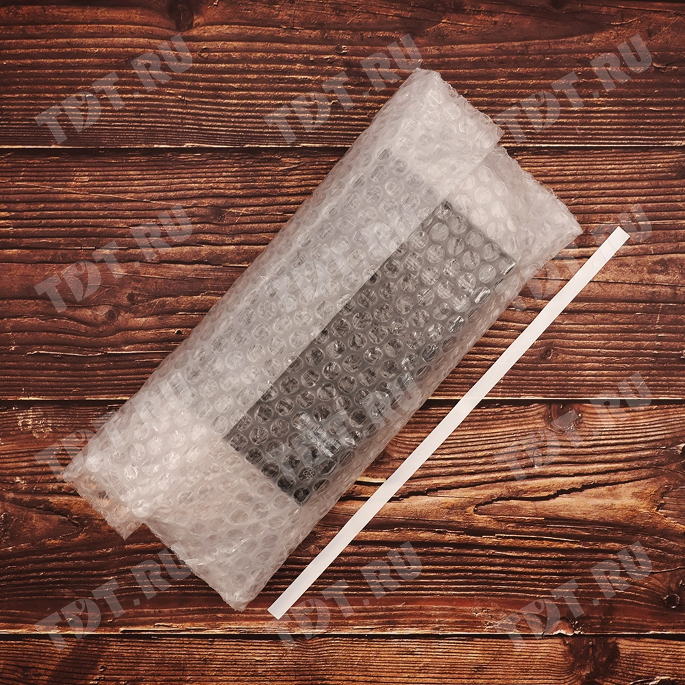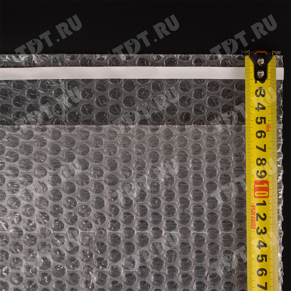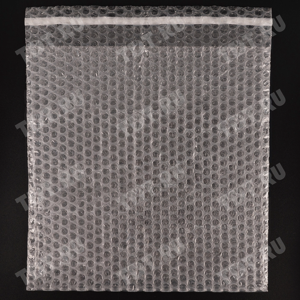 Прозрачный трехслойный воздушно-пузырчатый пакет длиной 15 см, шириной 15 см, с клеевым клапаном 5 см, диаметром пузырька 10 мм, плотностью 60 г/м². Изготовлен из полиэтилена. Производится в России компанией Бета-Куверт.
