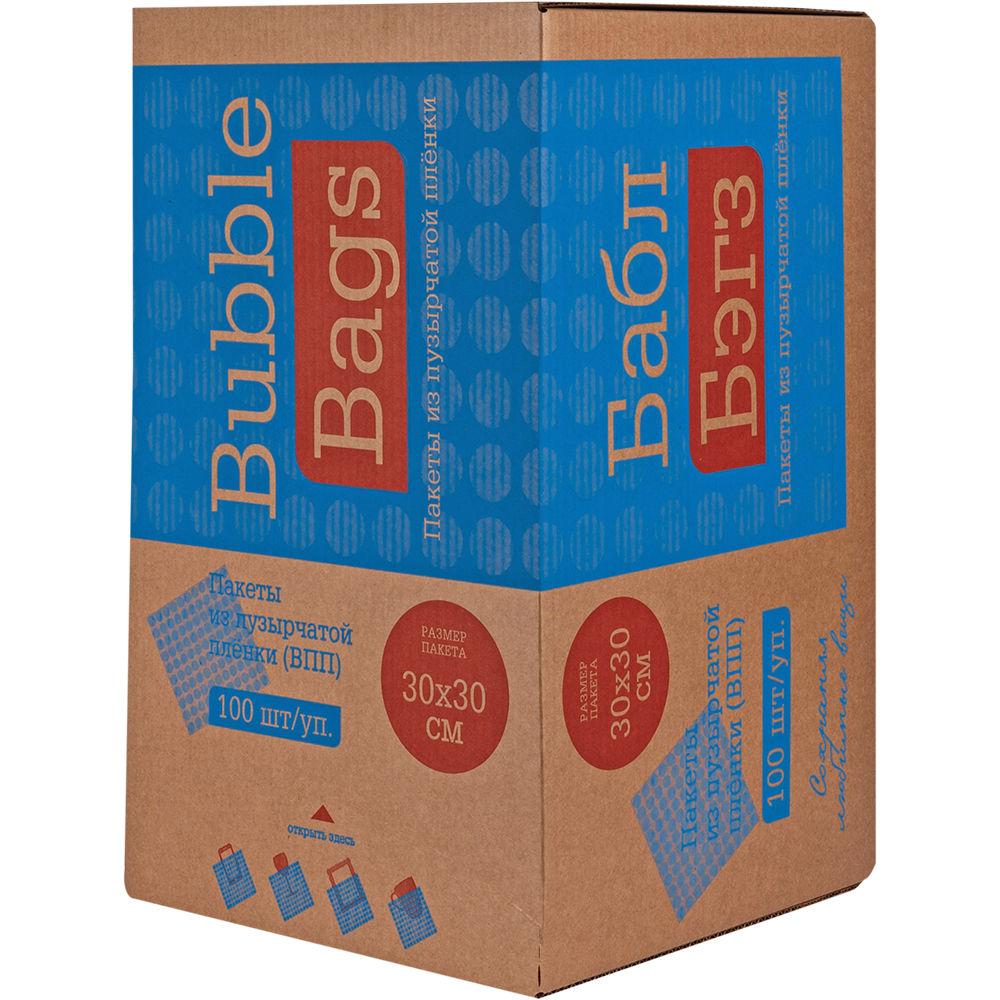 Прозрачные квадратные трехслойные воздушно-пузырчатые пакеты в коробке Bubble bags, длиной 30 см, шириной 30 см. В коробке 100 штук. Изготовлены из полиэтилена.