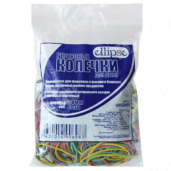 Банковские резинки ELLIPSE разноцветные, весом 50 г (без учёта упаковки), диаметром 60 мм.