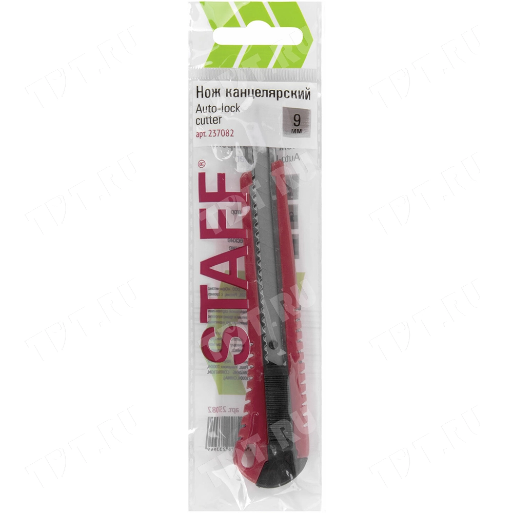 Нож канцелярский STAFF «Profit» с отламываемым лезвием и металлическими направляющими, код производителя 237082, Auto-lock cutter, шириной 9 мм. Материал корпуса – пластик. Производится в Китае.