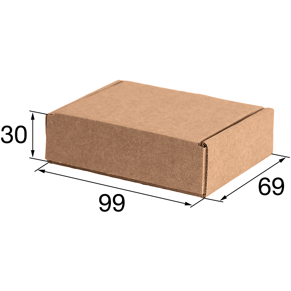 Самосборный короб №142, бурого цвета, длиной 99 мм, шириной 69 мм и высотой 30 мм. Изготовлен из микрогофрокартона Т-22К Е. Полезный объём — 0.2 л.
