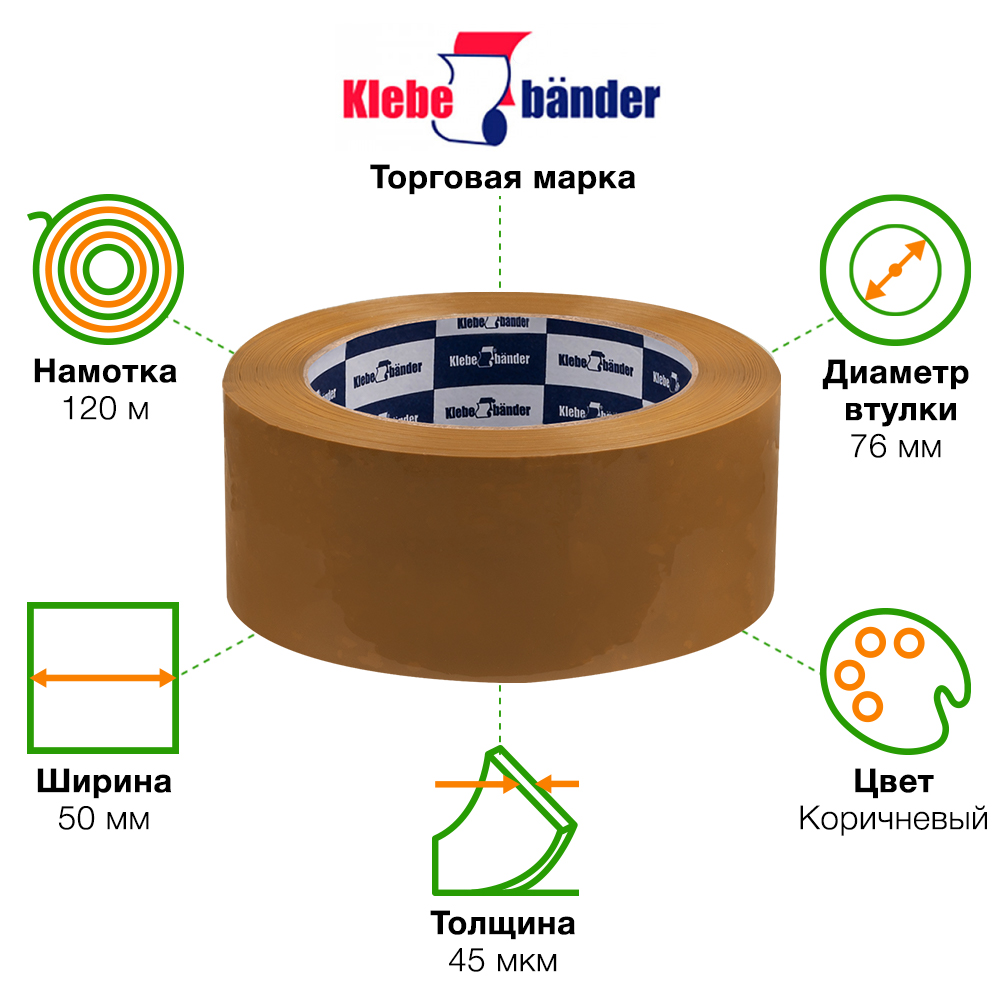 Клейкая лента Klebebander коричневая шириной 50 мм, диаметром втулки 76 мм, намоткой 120 метра, толщиной 45 мкм для ручной упаковки. Изготовлена на основе биосноориентированного полипропилена.