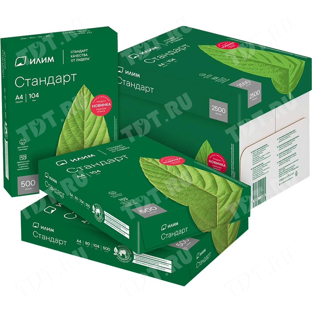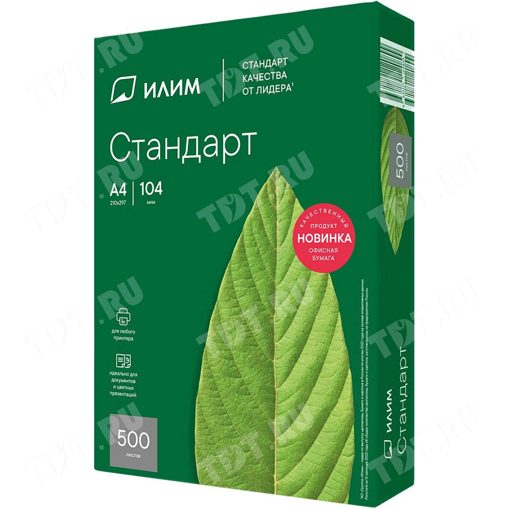 Универсальная офисная бумага Илим Стандарт белого цвета, формата А4, длиной 297 мм, шириной 210 мм, классом бумаги C, плотностью бумаги 80 г/м², толщиной 104 мкм, белизной 146%, непрозрачностью 91%, в упаковке по 500 штук. Производится в России.