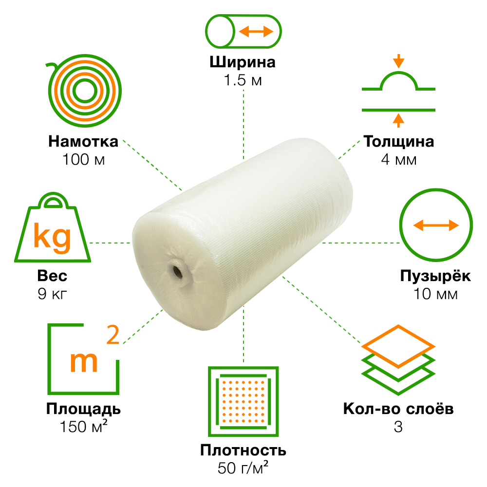 Прозрачная трёхслойная воздушно-пузырчатая пленка «Оптима», намоткой 100 м, шириной рулона 1.5 м, диаметром пузырька 10 мм, плотностью 50 г/м². Изготовлена из полиэтилена. Производится в России.
