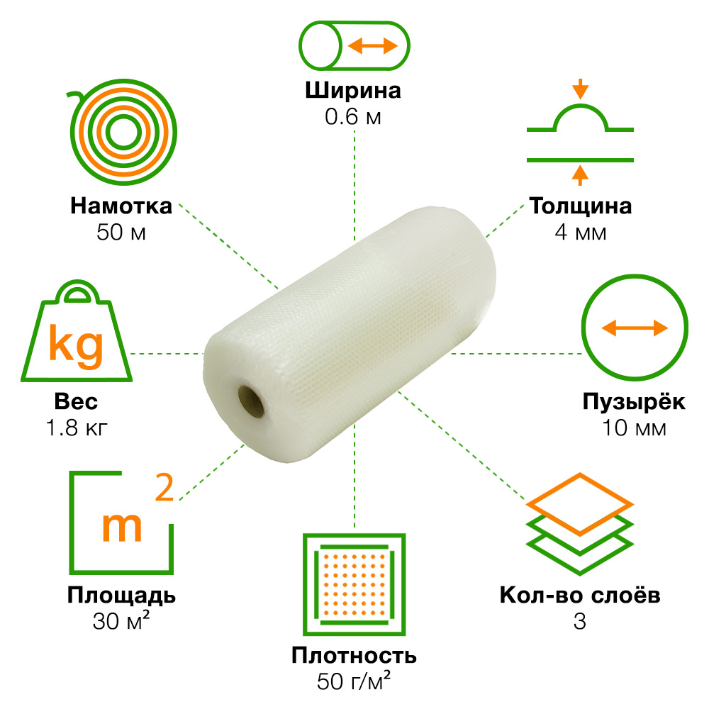Прозрачная трёхслойная воздушно-пузырчатая пленка «Оптима компакт», намоткой 50 м, шириной рулона 0.6 м, диаметром пузырька 10 мм, плотностью 50 г/м². Изготовлена из полиэтилена. Производится в России.