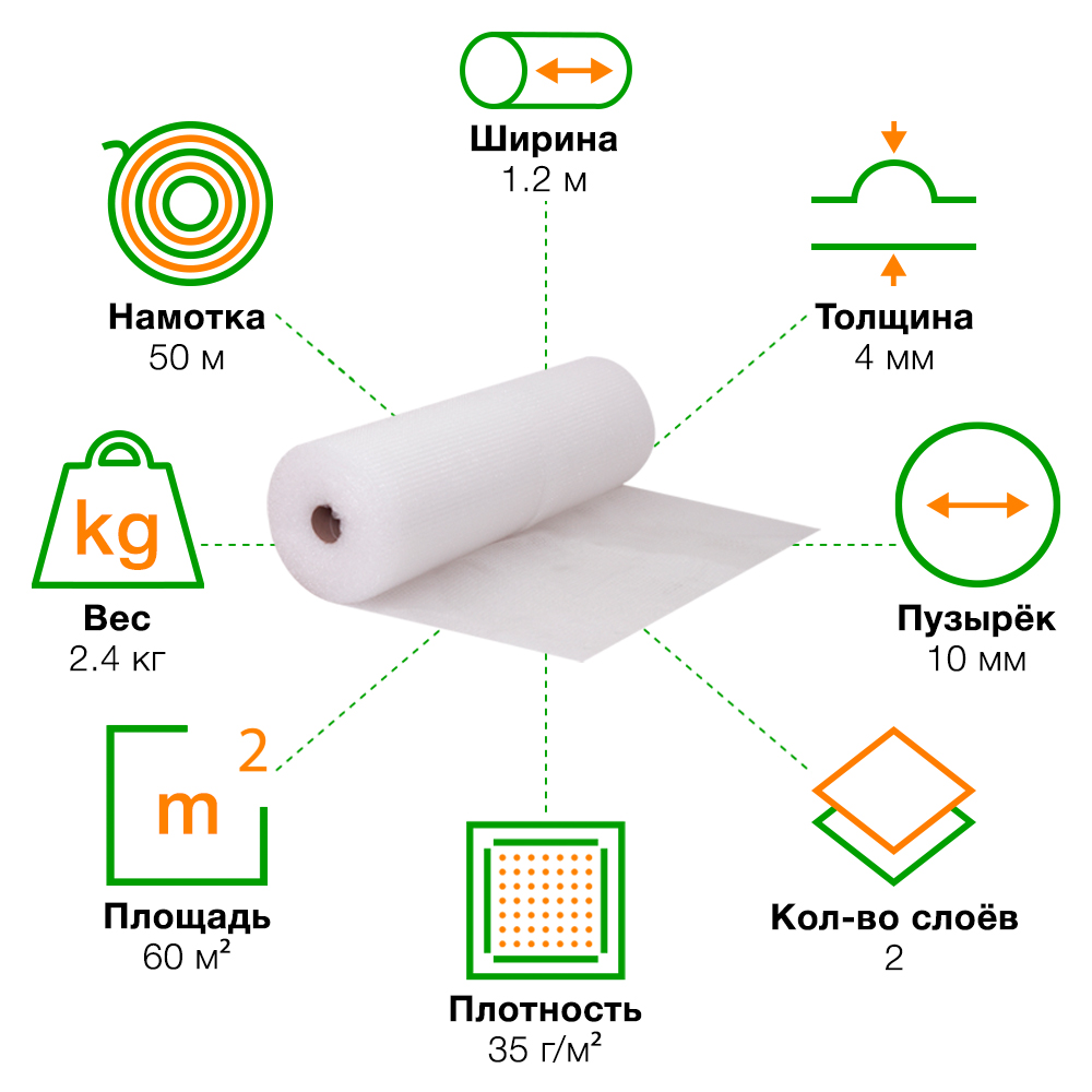 Прозрачная двухслойная воздушно-пузырчатая пленка «Оптима», намоткой 50 м, шириной рулона 1.2 м, диаметром пузырька 10 мм, плотностью 35 г/м². Изготовлена из полиэтилена. Производится в России.