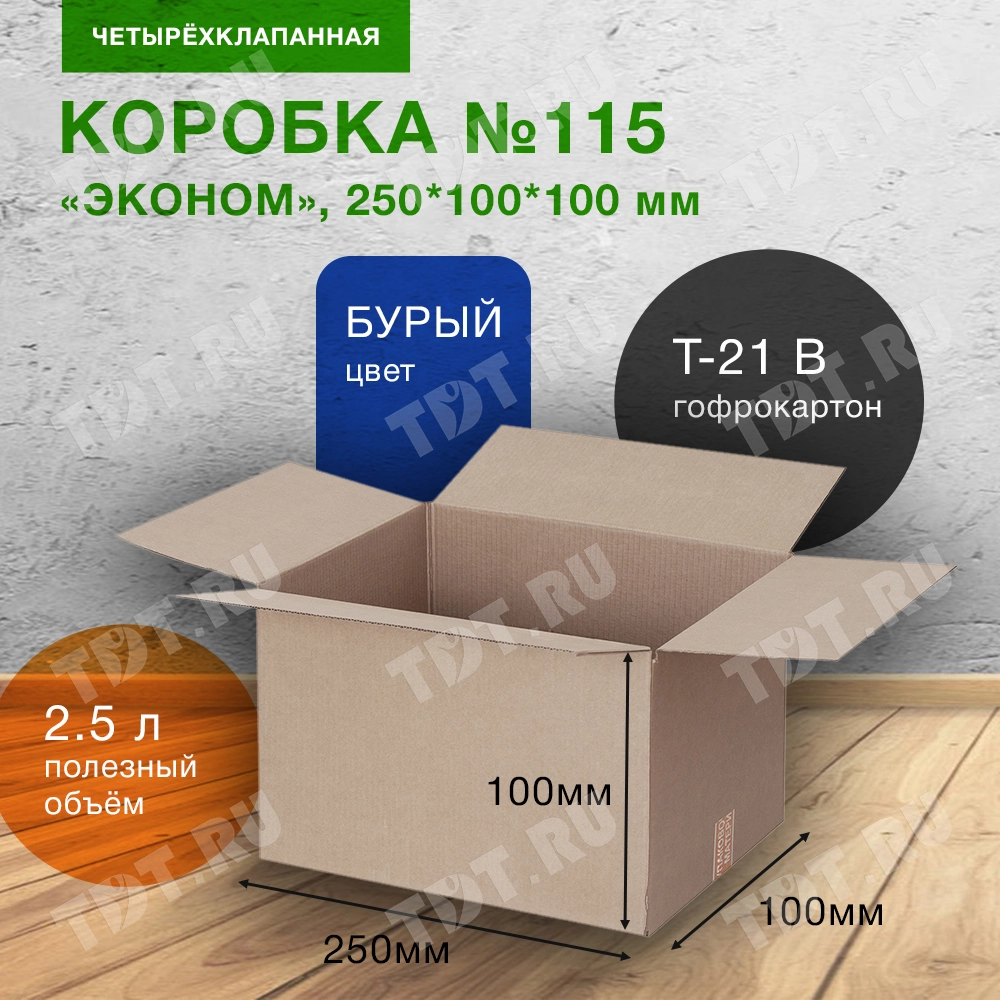 Короб «ЭКОНОМ» №115, длиной 250 мм, шириной 100 мм и высотой 100 мм. Изготовлен из трехслойного картона марки Т-21 В (100% вторсырье). Полезный объём — 2.5 л.