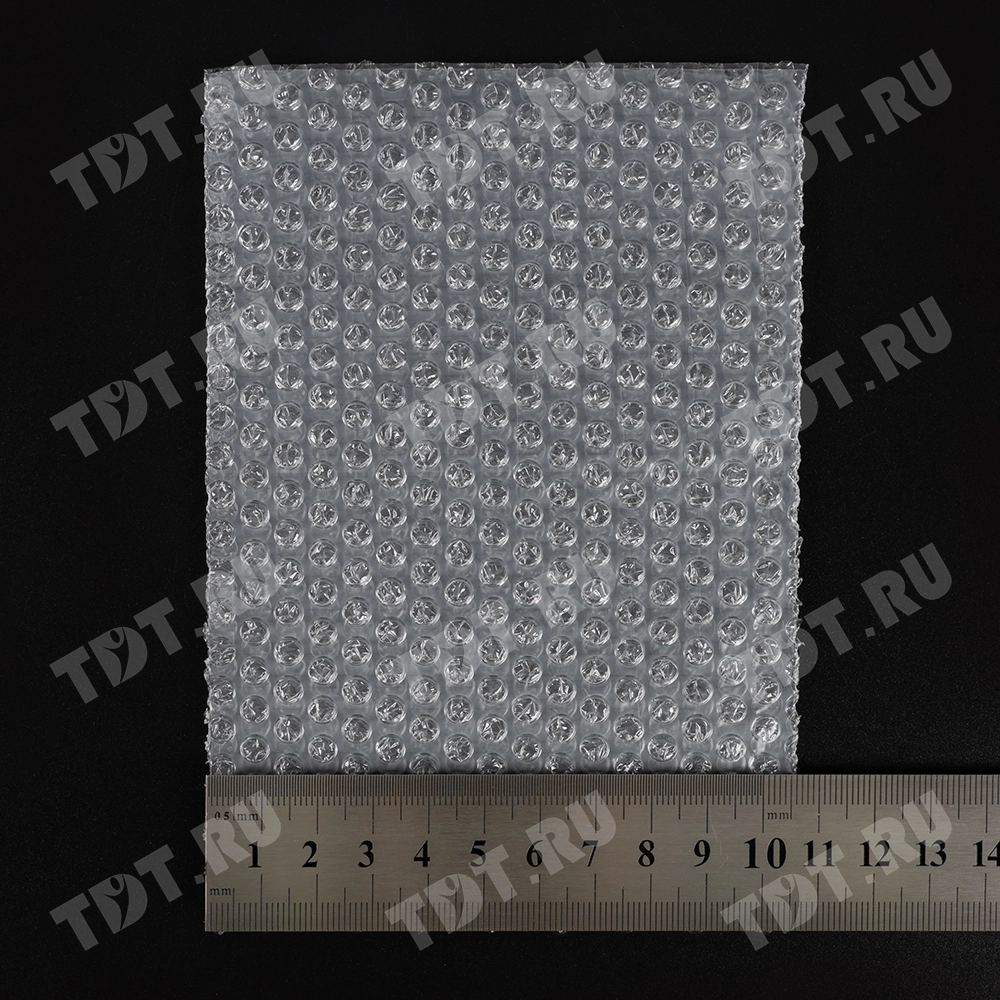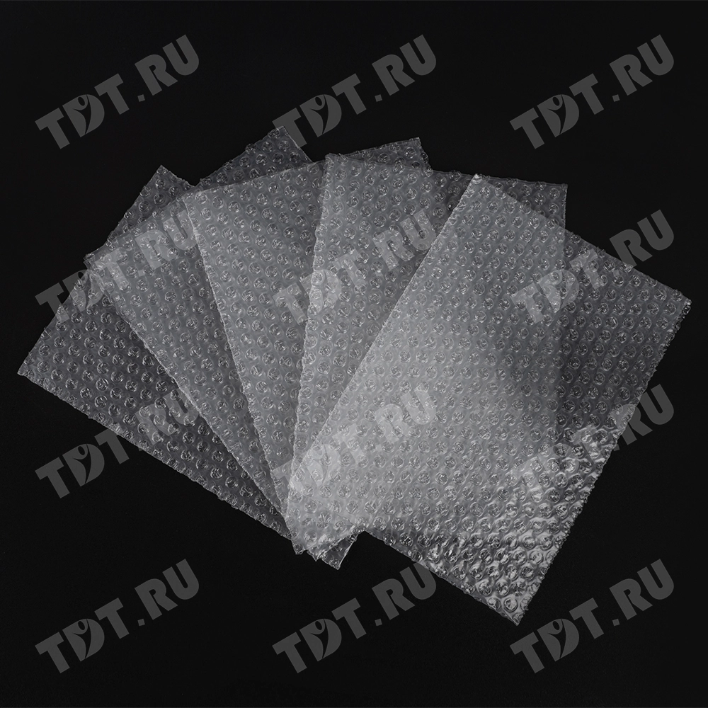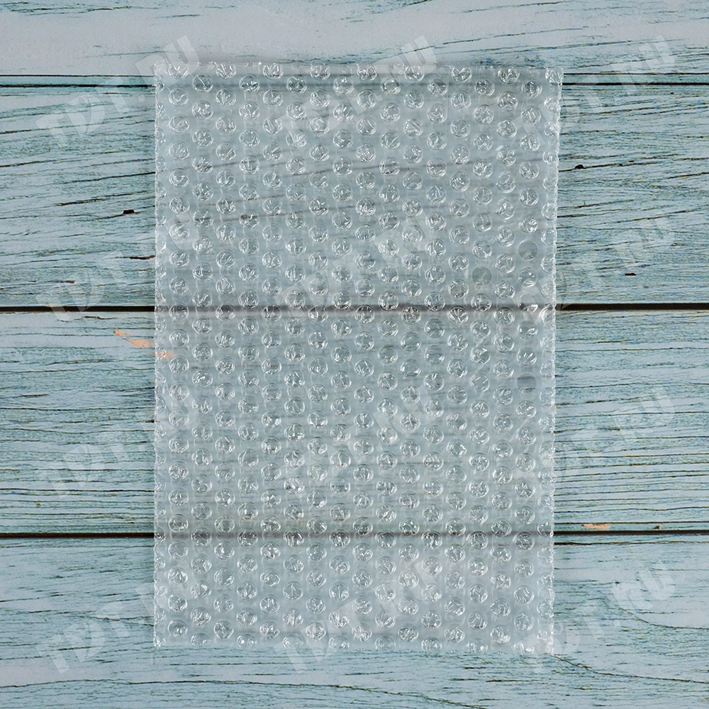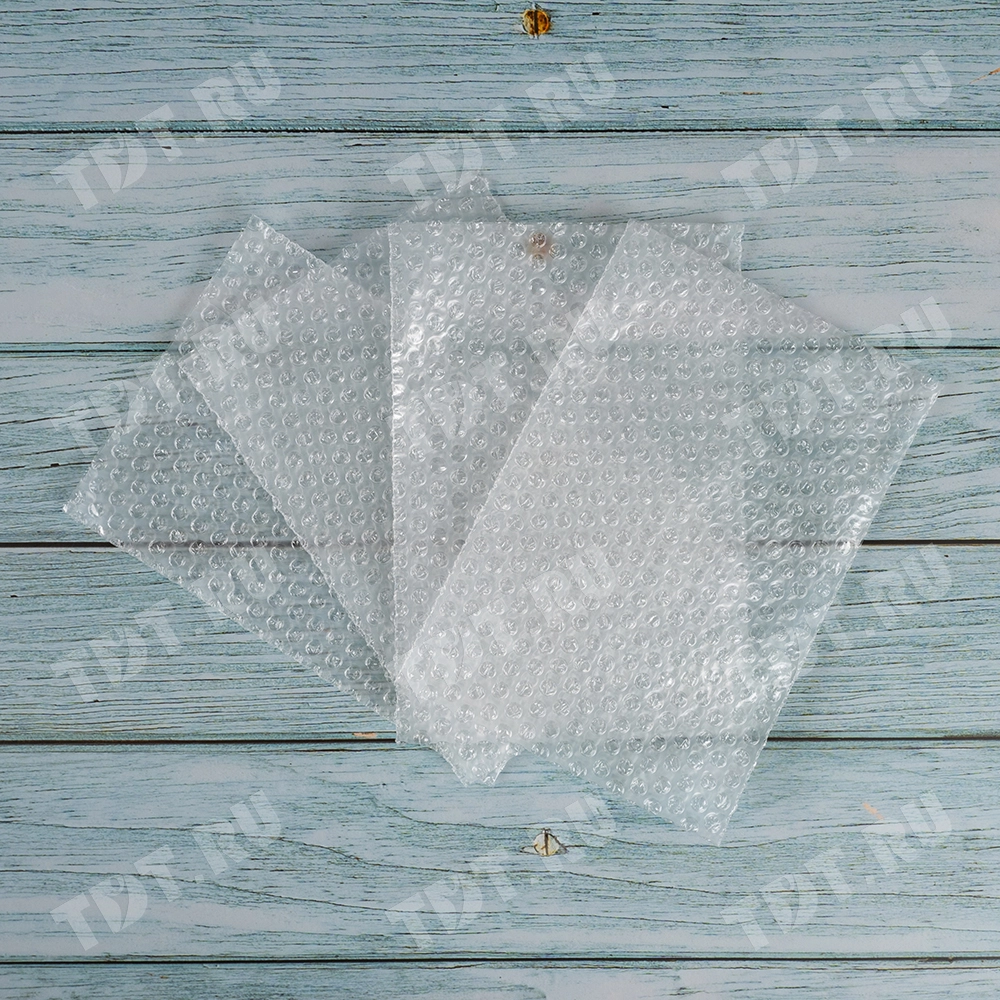 Прозрачные двухслойные воздушно-пузырчатые пакеты из пленки «МиниБабл», длиной 10 см, шириной 15 см, диаметром пузырька 5 мм, плотностью 25 г/м², открытие по узкой стороне. В коробке 300 пакетов. Изготовлен из полиэтилена. Производится в России.